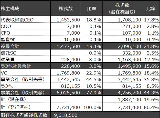 経営陣での持ち株比率が19.1%となっており、会社法上の決議事項については、常に外部株主との調整が必要な状況だと考えられます。 資本政策上、多額の資金をエクイティで集める必要があったものと考えられますが、スピーディな意思決定を担保するためには、経営陣の持ち株比率については過半数、もしくは3分の1をキープできるような資本政策が必要となります。また、代表以外の役員陣の現物株保有率が低いため、SOで調整していると考えられます。