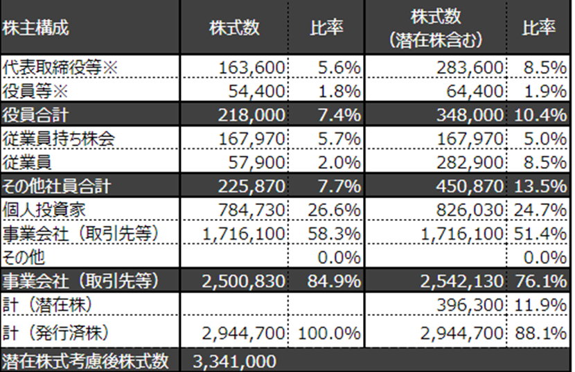 代表の持ち株比率が8.5%でかつその過半数が潜在株(SO)となっています。これまで検証した企業の代表が保有する平均持ち株比率が31.5%、最も低い持ち株比率の企業でも17.3%となっており、8.5%はかなり低い持ち株比率と言えます。また、経営陣及び従業員分を含めても3分の1に満たないため、重要な意思決定の際には都度株主との調整を行っていると考えられます。 代表の保有株式比率が低い理由としては、現代表が創業社長ではないため、社長就任に合わせて株式が付与されたためと考えられます。