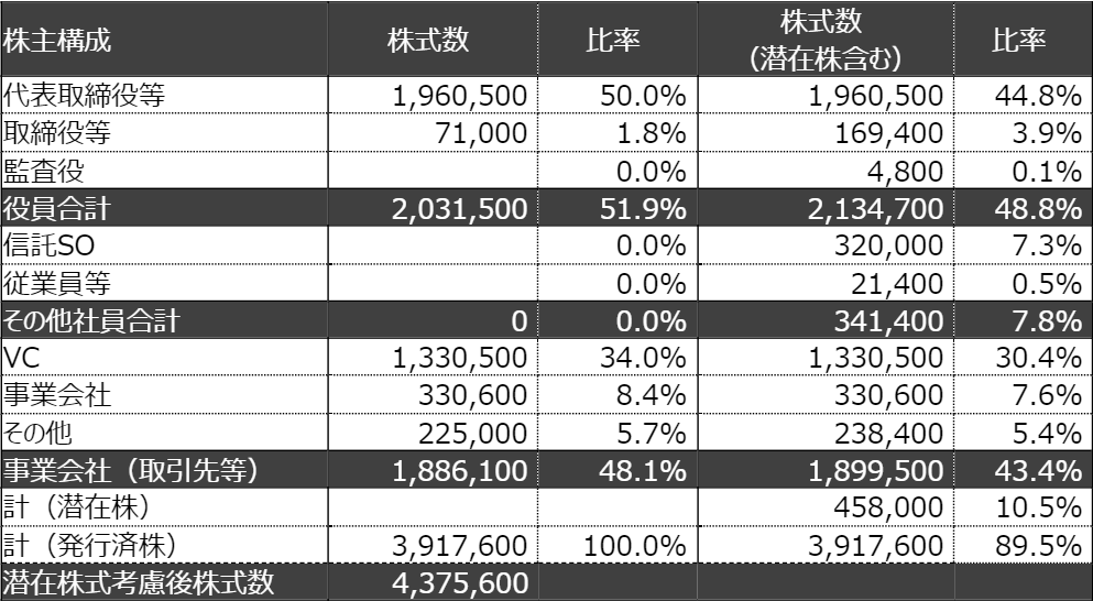 取締役及び執行役員を含めた経営陣での持ち株比率が顕在株ベースで51.9%と発行済み株式総数の過半数を占めています。そのため会社法上の決議事項(普通決議)については、経営陣主導で迅速に意思決定ができる状況でした。 経営陣の持ち株比率が過半数を占めていると、多くの意思決定について経営陣のみで決定することができるため、迅速な意思決定が求められるスタートアップとして有効な資本構成だと考えられます。