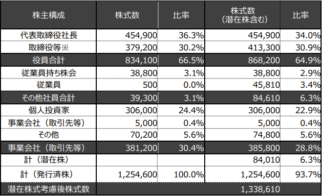 代表取締役社長と取締役によって、会社法で規定される特別決議事項を決議できる必要株数をほぼ保有しています。厳密にはコンマ数%足りませんが、おそらく退職した従業員の株等の議決権をコントロールして特別決議事項を決議していたのではないかと想定されます。 これはベンチャーキャピタルのような完全な第三者株主がおらず、非上場段階では経営陣の意思決定を迅速に実行できる柔軟な資本政策を策定することが可能であったことが考えられます。