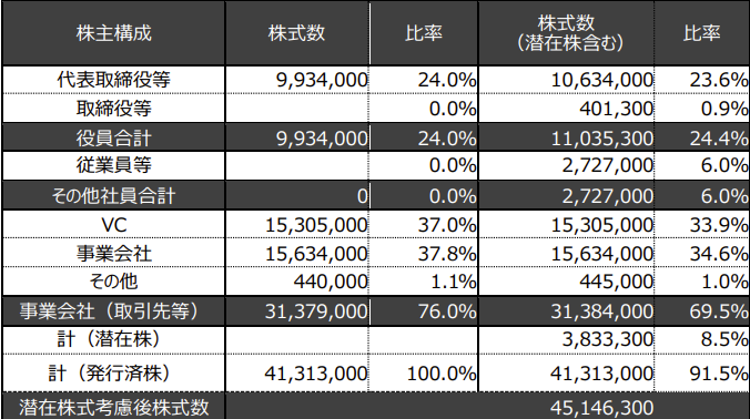 経営陣のなかでは代表取締役社長のみが顕在株を保有しており、その持ち株比率は24.0%となっています。そのため会社法で規定される普通決議事項以上の決議については他の株主との協議が必要な状況となっています。なおdely社は2018年7月にヤフー株式会社(現LINEヤフー株式会社、以降ヤフー社)の連結子会社となっており、【株主の状況】でもヤフー社が筆頭株主となっており、両者での持ち株比率は顕在株ベースで53.25%と普通決議事項を決議できることができる状態となっています。
